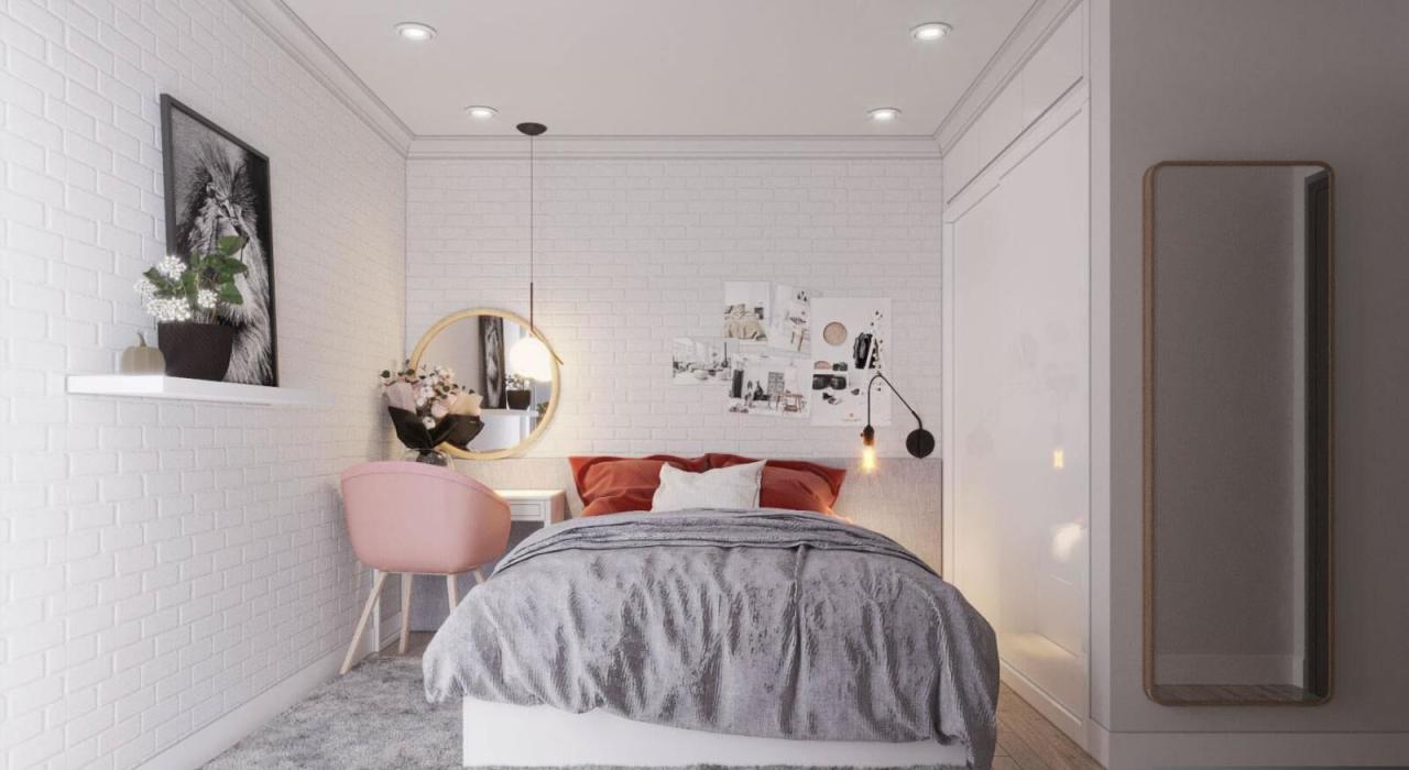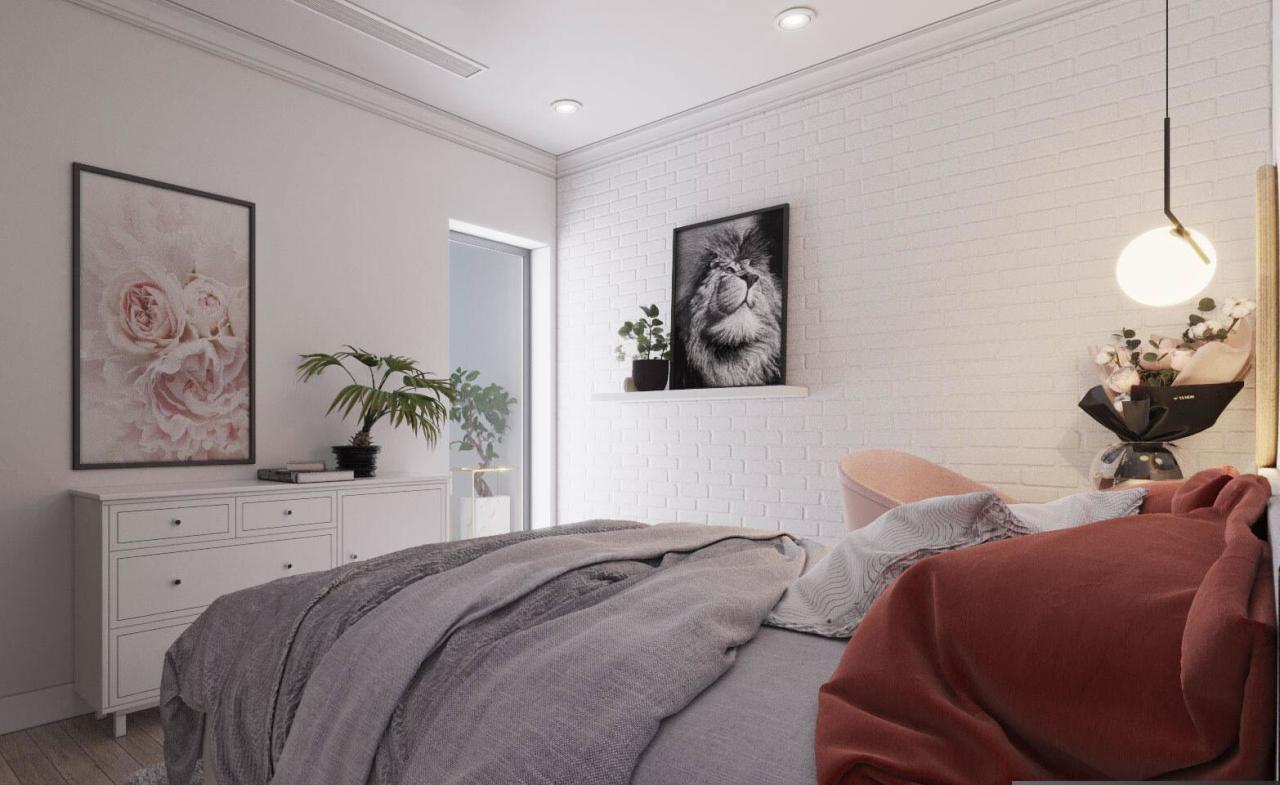 Phòng ngủ thứ hai diện tích nhỏ hơn so với phòng master, được thiết kế với tông màu trắng chủ đạo để giúp không gian rộng hơn về mặt thị giác.