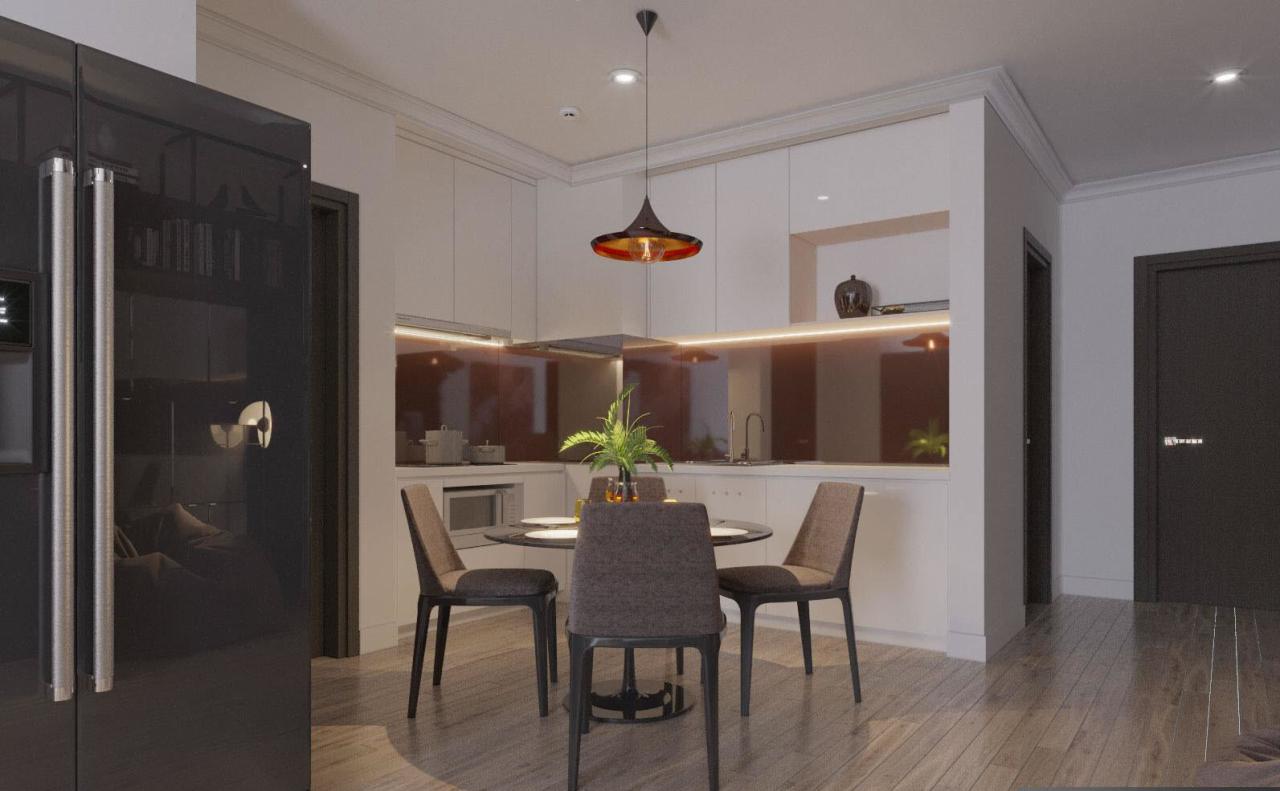Bàn ăn hình tròn kết hợp 4 ghế ngồi bọc nỉ màu xám sang trọng, hài hòa về mặt bố cục và kết cấu với gian bếp chữ L bên trong. Tủ bếp cao kịch trần sơn màu trắng tạo cảm giác thoáng rộng hơn cho không gian nấu nướng.