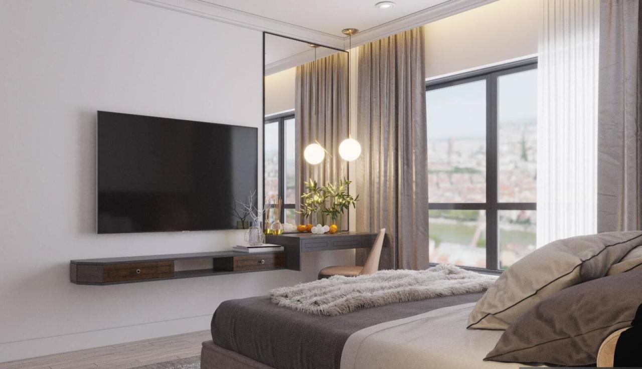 Kệ tivi nối liền bàn trang điểm được gắn trực tiếp vào tường, tạo độ thông thoáng cho không gian ngủ nghỉ. Gương lớn hút sáng tự nhiên tối ưu.
